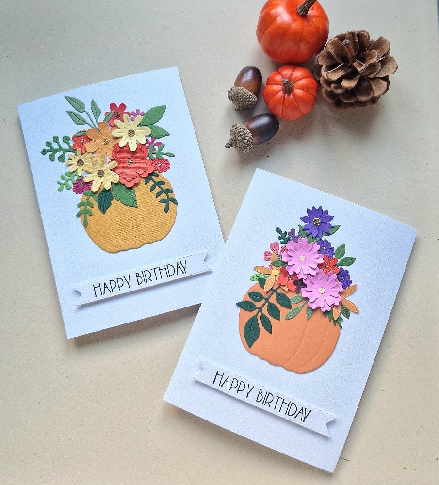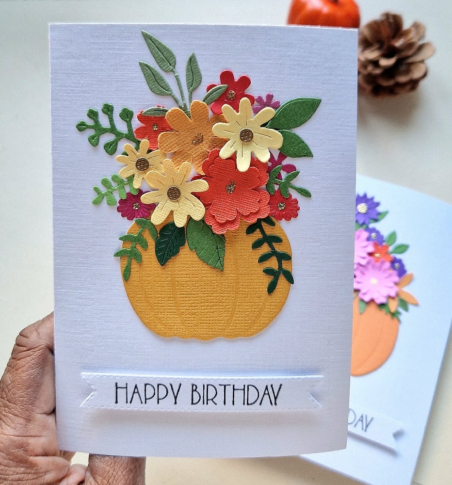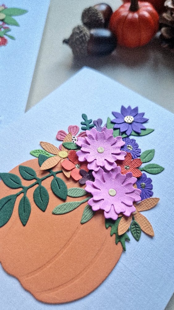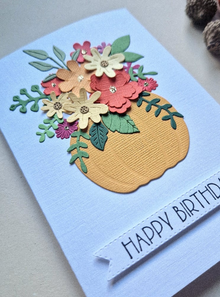 Gorgeous, handmade, pumpkin bouquet card finished with pretty foliage on white linen style card..